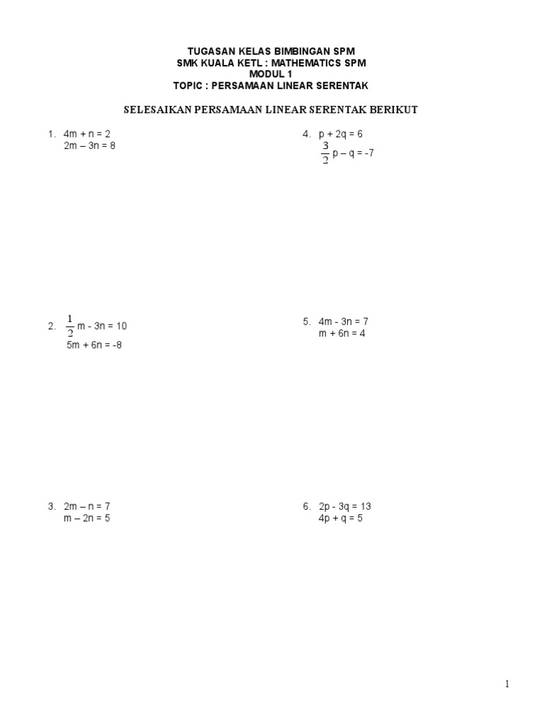 Soalan Persamaan Linear Spm. Calculate the value of k and n that satisfy the following simultaneous equations. Gantikan nilai yang diperoleh ke dalam persamaan asal untuk mencari nilai pemboleh ubah yang satu lagi.